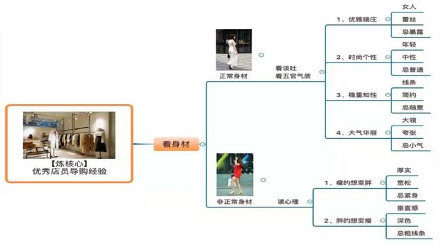 將進入門店的客戶通過看身材分成結構化兩大類,然后再通過和看五官、談吐、想瘦還是想胖再細分成六大類型,然后在推薦相應的服裝,讓客戶試穿后,有眼前一亮的感覺,銷售自然大幅度提升了。