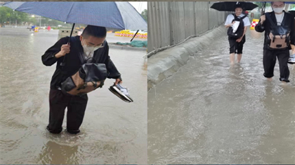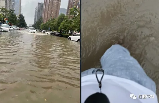 16點,紅圈運營團隊的幾名同事剛剛結束對一家客戶拜訪,正在前往另一家客戶的路上,此時雨水已經淹沒膝蓋。