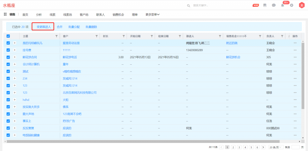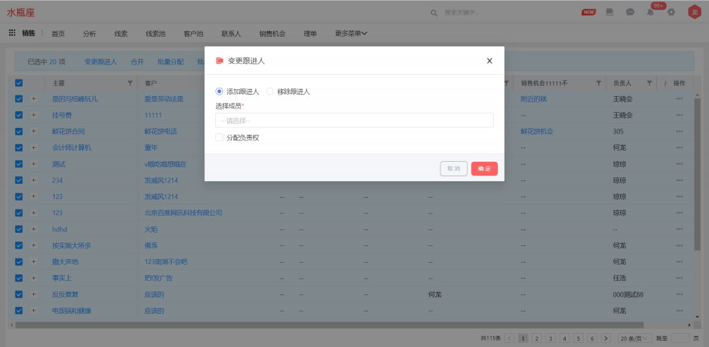 業(yè)務(wù)對(duì)象支持批量增加和刪除跟進(jìn)人,同時(shí)增加“跟進(jìn)人”字段,與跟進(jìn)人組件同步,并支持篩選;使用前請(qǐng)先在對(duì)象管理中,將“跟進(jìn)人”字段及“變更跟進(jìn)人”按鈕的權(quán)限進(jìn)行勾選