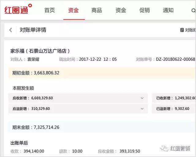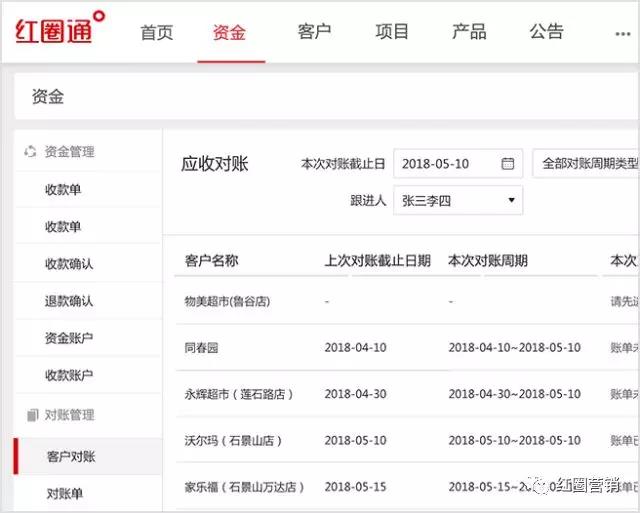 在6.5.3版本,紅圈后臺的資金功能中新增“客戶對賬”,為每個客戶設(shè)定對賬周期、定期生成對賬單。對賬單清晰呈現(xiàn)每個客戶在該對賬周期的應(yīng)收、已收、期末應(yīng)收金額以及發(fā)生金額明細,大大提高對賬效率。