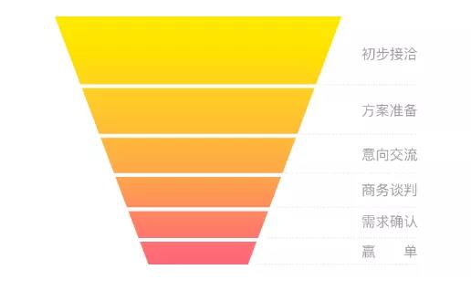 舉個例子,健康的銷售漏斗應該是上圖這樣的,各階段的轉化率比較均勻,如果漏斗在中間某一段突然收窄,可能是在業務推進的某個階段出現了瓶頸,這時企業需要結合產品的銷售周期等因素,尋找漏斗“阻塞”的原因,及時做出調整。