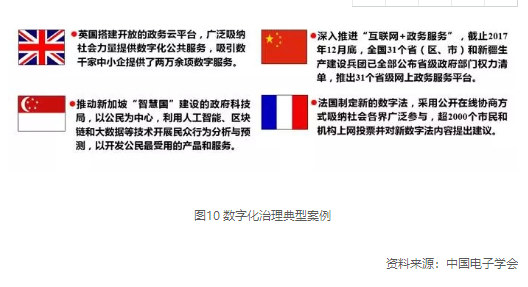 在數字經濟時代,政府構建完善社會治理體系的一大特征,就是以更好服務和管理公眾為導向,以效率提升、功能完善為主旨,大量采用以互聯網、大數據、人工智能為代表的新一代信息技術,感知社會態勢、暢通信息渠道、輔助科學決策,提升治理能力的現代化水平。網絡化的架構和理念已在政府事務領域得到深度融合應用,未來將在進一步優化事務流程的同時,重點提升政務服務的便捷性和政府的綜合服務能力。構建統一、共享的開放數據平臺已成全球趨勢,將實現跨層級、跨區域、跨行業的協同管理和服務,為精準化、高效化的社會治理提供決策支持。各類網絡化、智能化信息平臺加速構建,鼓勵和引導社會公眾積極參與治理過程,逐步形成共策共商共治的良好生態。