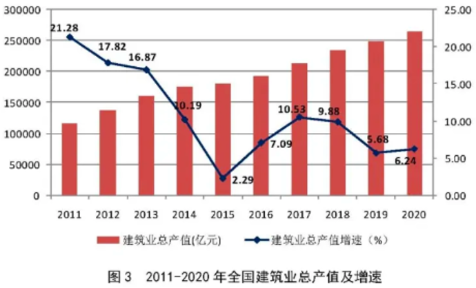 過去的10年、20年,整個建筑行業經歷了一個波瀾壯闊的發展。2000年全國建筑業產值1萬億,2020年就達到26.4萬億。