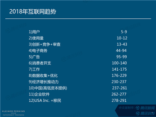 2018年互聯網趨勢報告正式發布,本次報告全面概括了2017年全球互聯網發展趨勢,從用戶、電商、廣告、消費支出、數據獲取和優化、經濟增長驅動力、中國市場、企業軟件等12個章節。