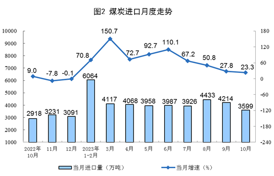 原煤生產增速加快,進口較快增長。10月份,生產原煤3.9億噸,同比增長3.8%,增速比9月份加快3.4個百分點,日均產量1254.0萬噸。進口煤炭3599萬噸,同比增長23.3%,增速比9月份回落4.5個百分點。