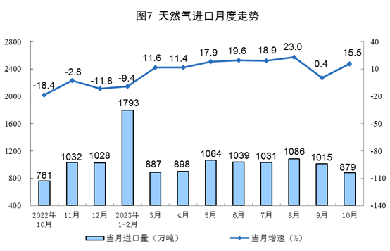 天然氣生產保持平穩,進口增速加快。10月份,生產天然氣190億立方米,同比增長2.6%,增速比9月份回落6.7個百分點,日均產量6.1億立方米。進口天然氣879萬噸,同比增長15.5%,增速比9月份加快15.1個百分點。