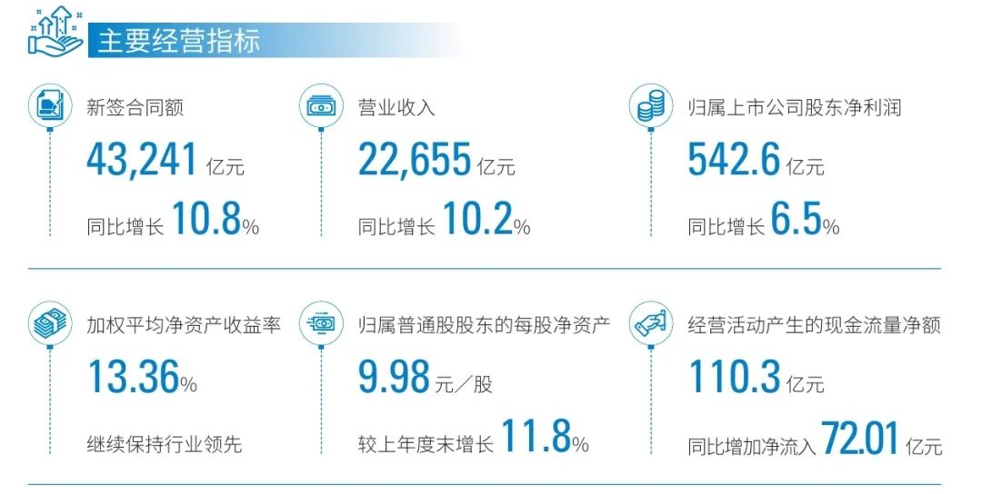 2023年,中國建筑實現營業收入22655億元,同比增長10.2%;歸屬于上市公司股東的凈利潤542.6億元,同比增加6.5%。境內營業收入21498億元,同比增長10.4%。