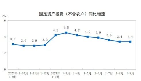 2024年1—9月份,全國固定資產投資(不含農戶)378978億元,同比增長3.4%。其中,民間固定資產投資191001億元,下降0.2%。從環(huán)比看,9月份固定資產投資(不含農戶)增長0.65%。