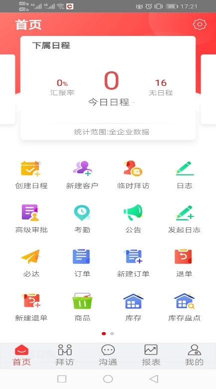 登陸后,下方為主要的操作按鈕:首頁、拜訪、溝通、報表、我的。首頁為主要的功能模塊,可以通過右上角的設置(齒輪按鈕)來進行模塊調整;
