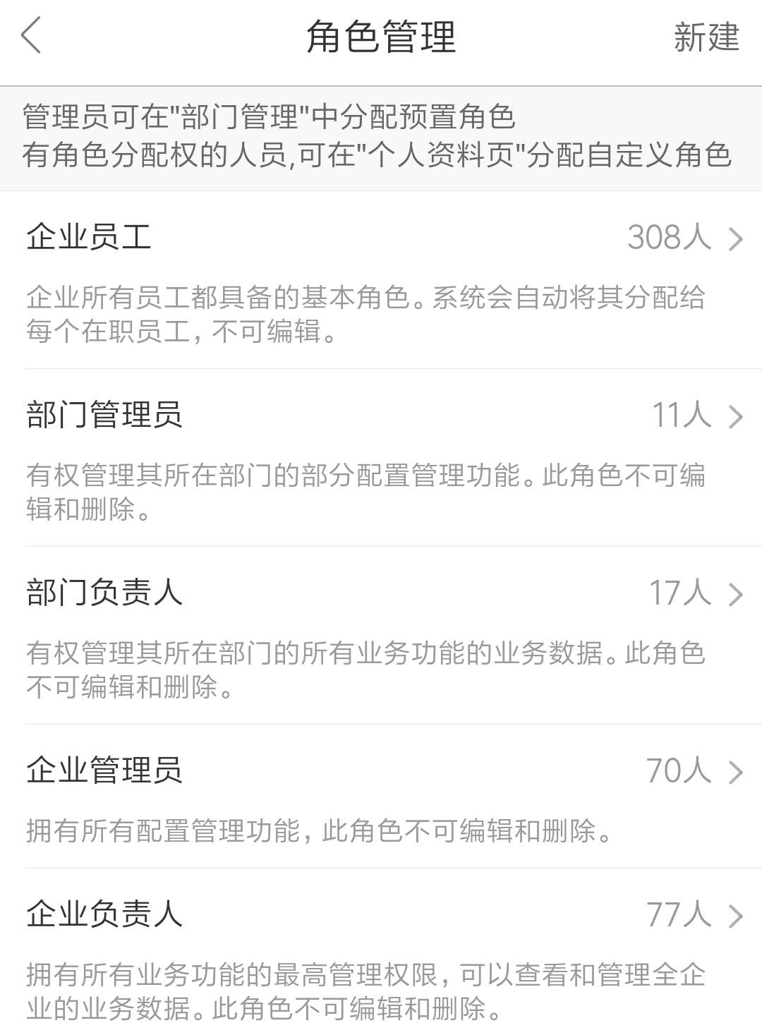 在角色管理中,會默認有五種角色:企業負責人、企業管理員、部門負責人、部門管理員、企業員工。